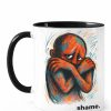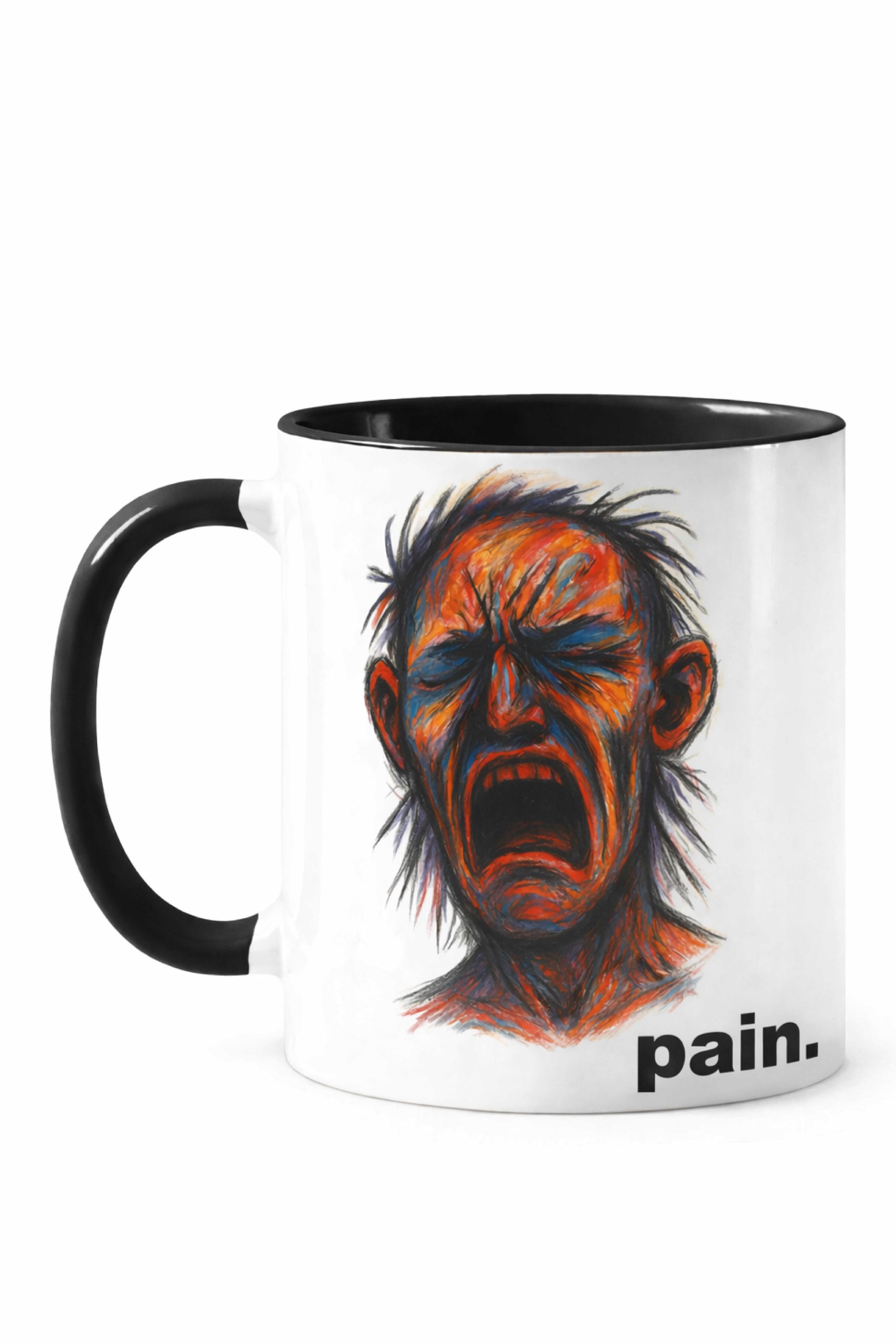 Un design artistic puternic, cu tușe dramatice și culori contrastante, care surprinde vizual tensiunea și durerea interioară. Mesajul simplu, direct – pain. – transformă cana într-un statement vizual curajos.